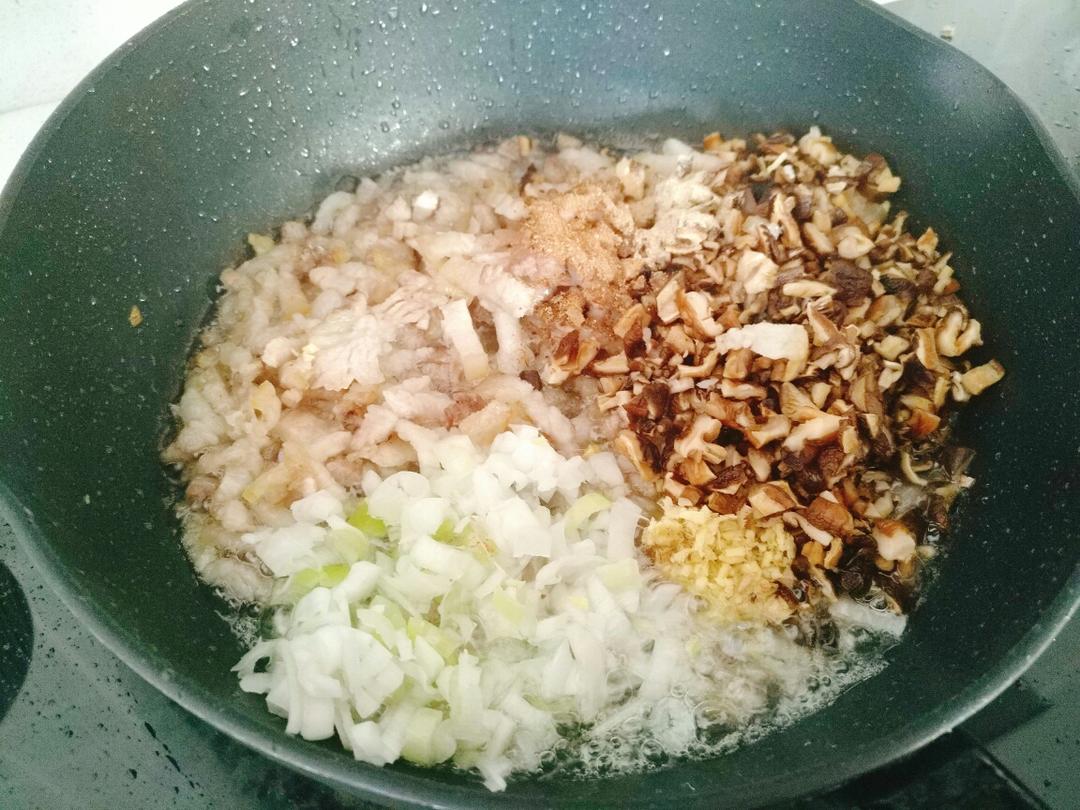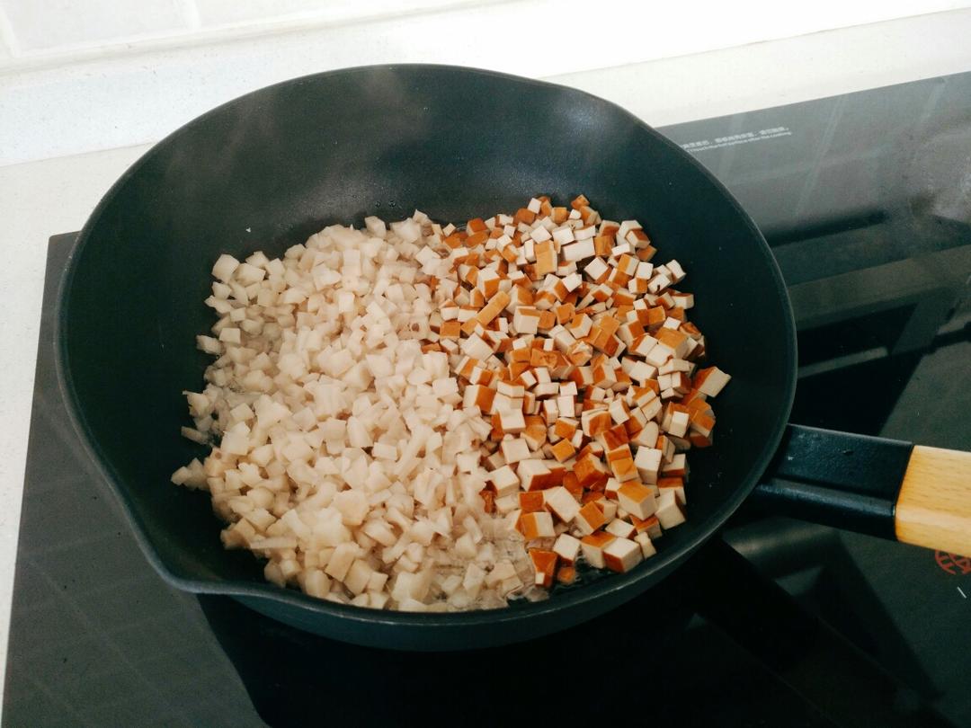 准备所有食材。 五花肉用水汆烫,20分钟后捞出,切边长三毫米的细条。 藕、豆干、香菇切0.5厘米的小方块。泡发香菇的水留用。