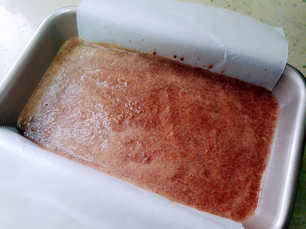 倒入铺了烘焙纸的模具中,抹平表面,轻震几下震出大气泡。 注:我用了磅蛋糕模具,大小跟6寸圆形模具差不多!