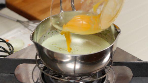 将打好的蛋黄加入抹茶奶油中。