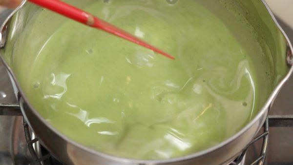 开小火加热蛋奶糊。一边加热一边搅拌,抹茶粉很容易分离出来沉淀,加热后的蛋奶糊会稍微粘稠,帮助防止沉淀。