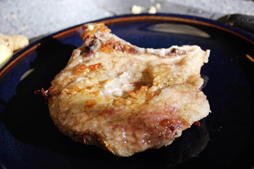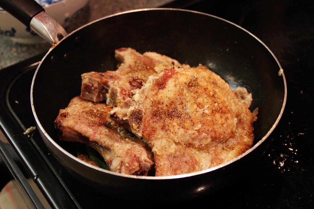 1. 翻面再煎2mins 30s至表面金黄即可 2. 取出放置在一旁 Tips: 我这里其实照片没拍好,你可以用筷子戳一下这块大排,感觉表面脆脆的就可以啦!
