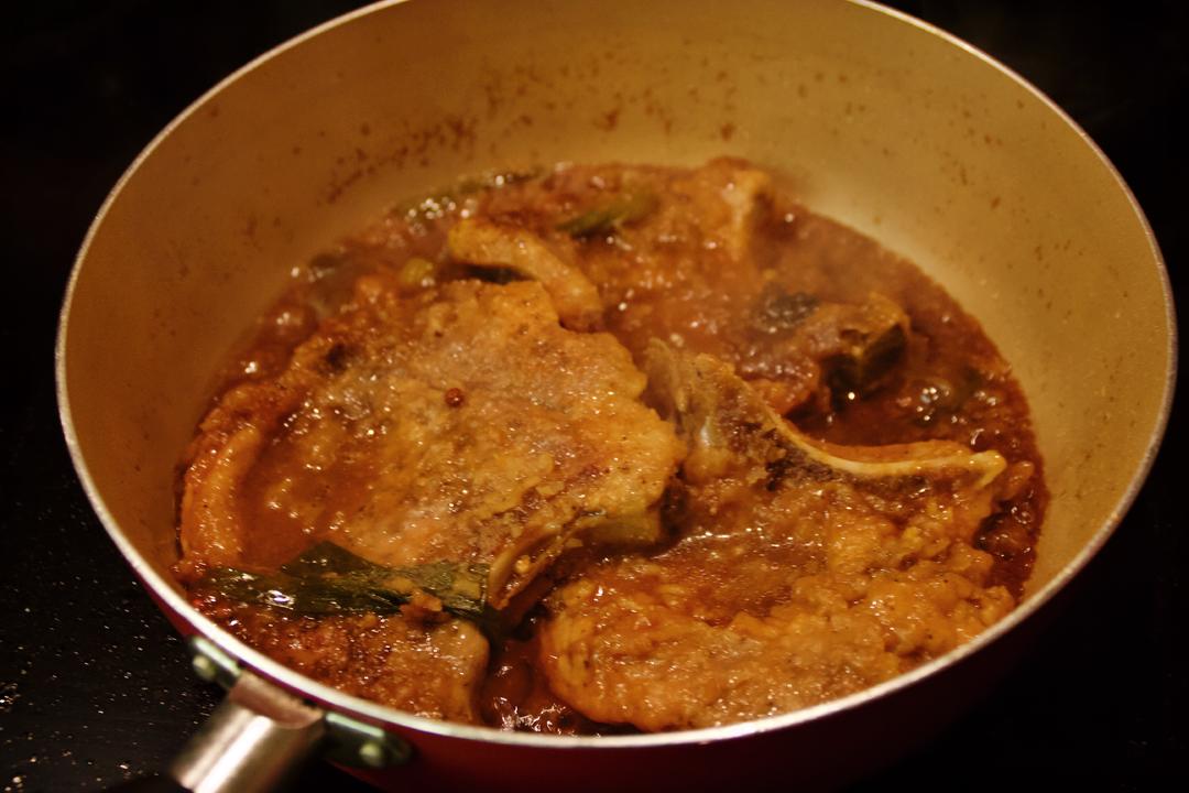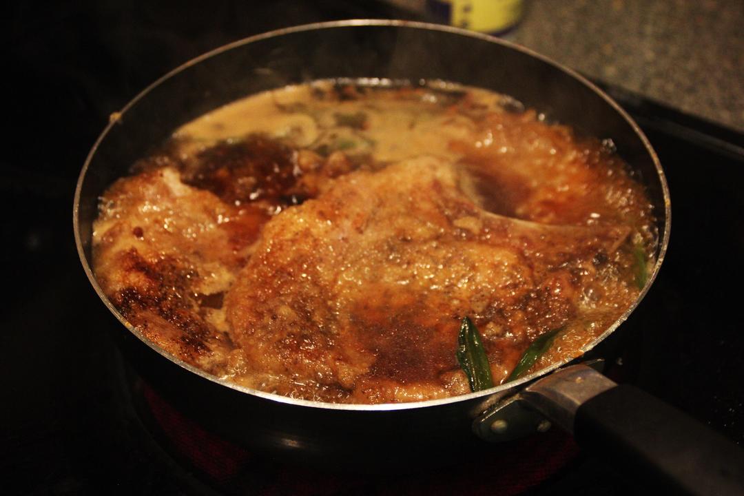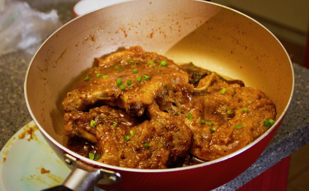1. 放入三块煎制好的大排 2. 均匀的把酱汁淋在大排上面 Tips: 兄弟,那个大一点的锅吧,这人脸大小的大排在这里面真的有些...