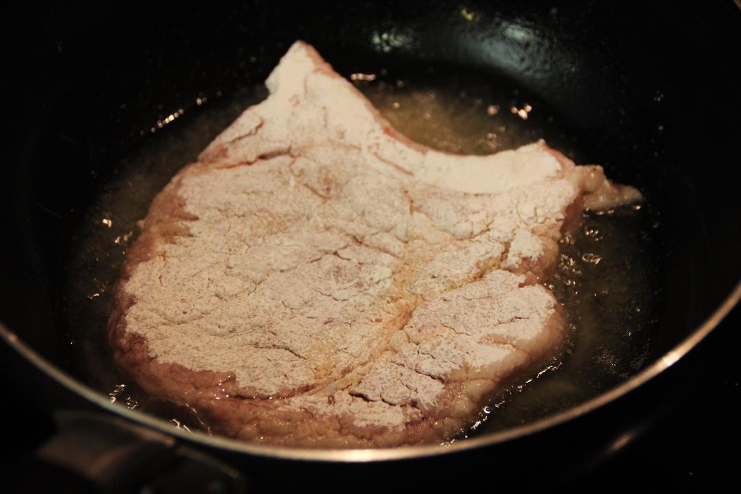 1. 热锅中火加入没过底部的油,待油温升高 2. 大排裹上淀粉,轻轻拍去多余的淀粉 3. 大排放在锅内,每面煎制2分30s直至金黄 Tips: 在大排的表面裹上一层薄薄的淀粉,这样会在大排的表面形成一层薄膜,这样可以防止肉汁的流失。具体炸的时间因人而异,只要表面金黄就行了。