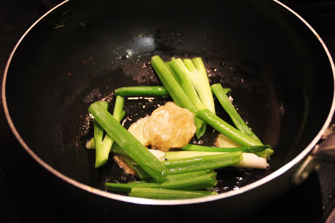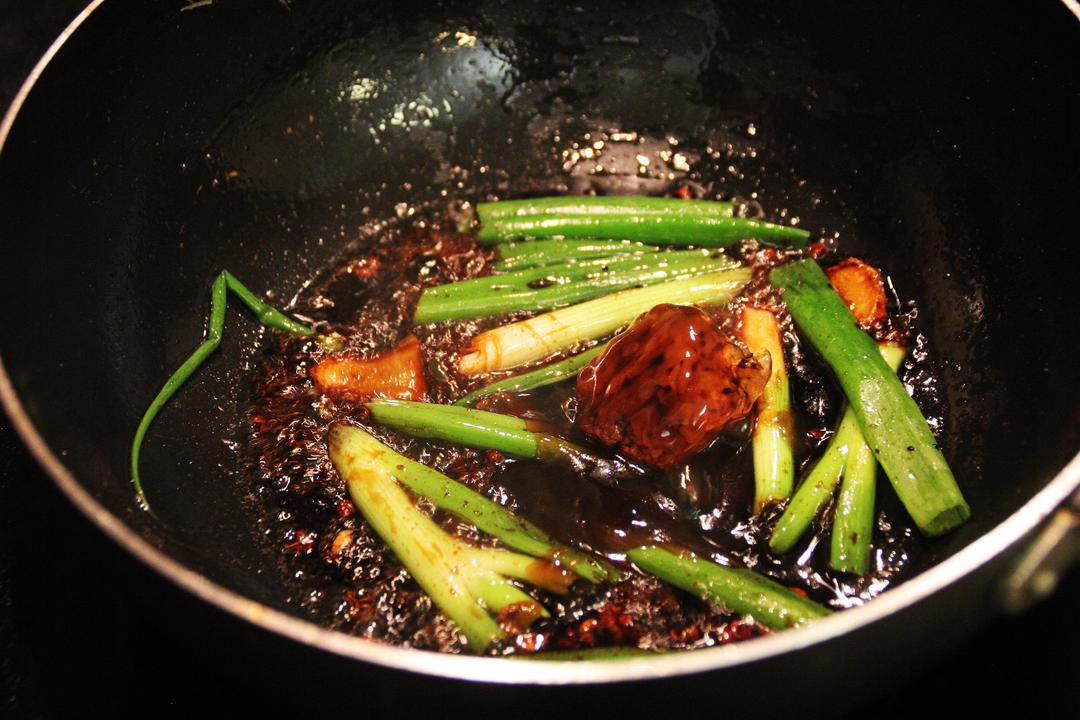 1. 取一个热锅加入少许底油 2. 加入10粒花椒,1颗八角和4个干辣椒 3. 加入生姜和葱蒜 4. 加入1个3cm*3cm*3cm的冰糖(4g) Tips: 很简单的嘛!基础爆锅三件套*2(葱姜蒜 + 花椒八角和干辣椒)。冰糖不怕放少,但怕放多,做的时候后期煮的时候尝一下会比较好然后再进行调整。