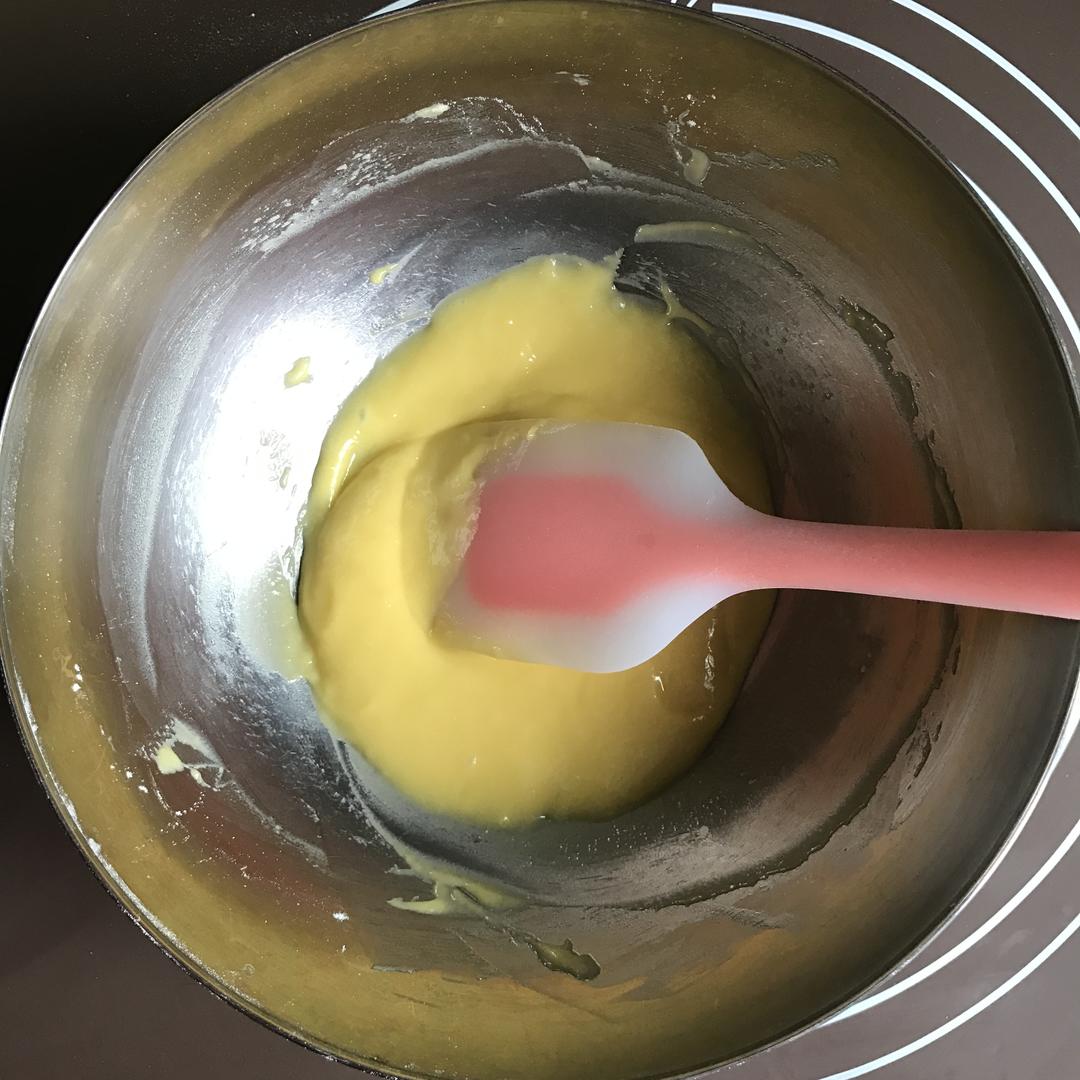筛入低筋面粉,然后用刮刀搅拌至无干粉状态