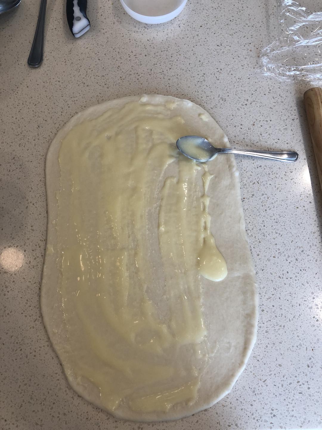 将放室温软化黄油与练乳混合,凃在面上