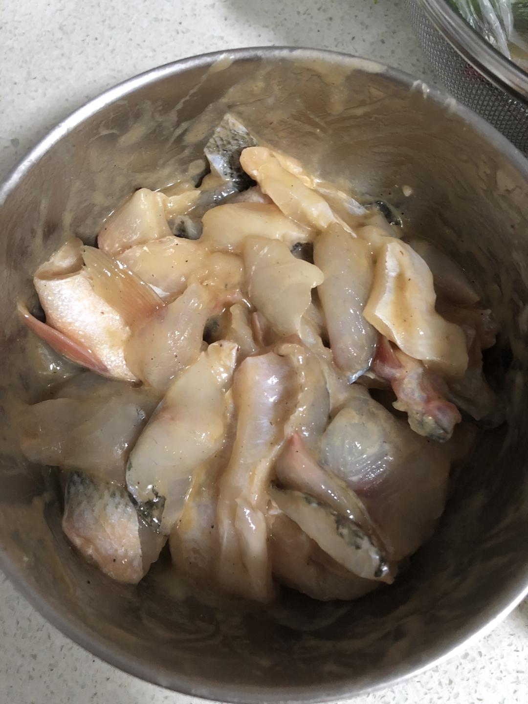鱼肉片出来。加入1个鸡蛋清,2勺生粉,一勺酱油,一勺油,盐和鸡精,抓均匀。上浆。