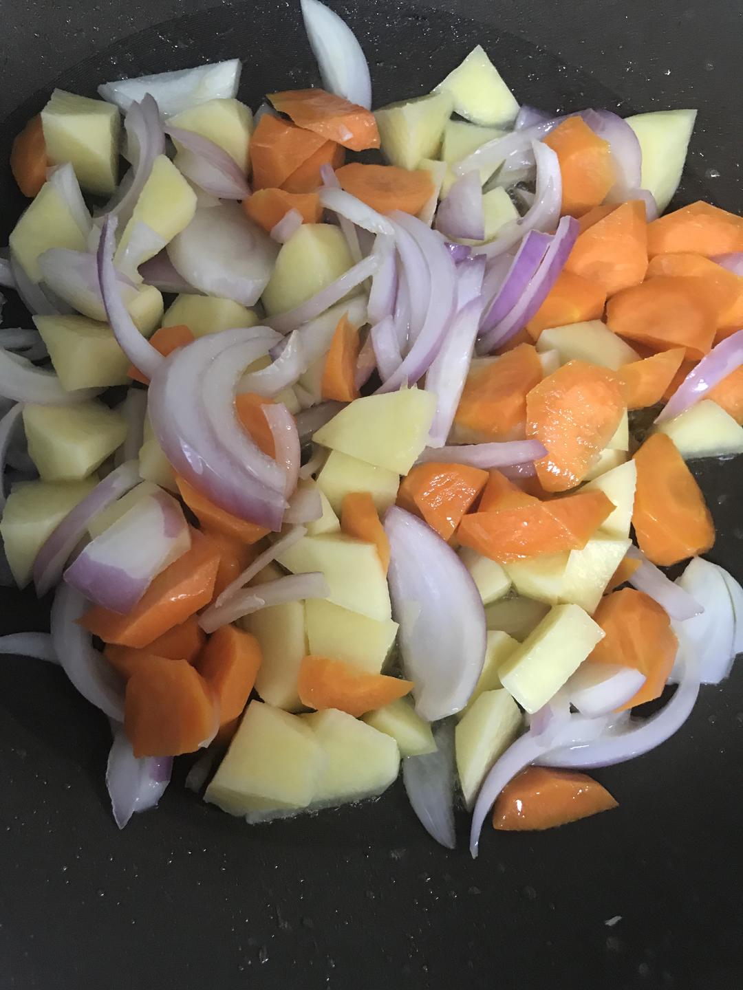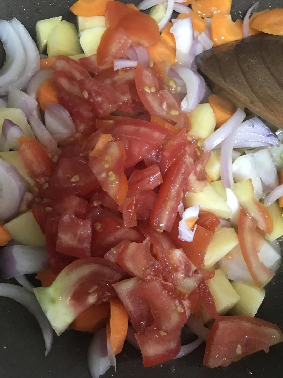 番茄切成小块(你们记得去皮,我懒,没去),土豆和胡萝卜切成滚刀,小一点,之后好煮入味煮烂,洋葱随意切吧!