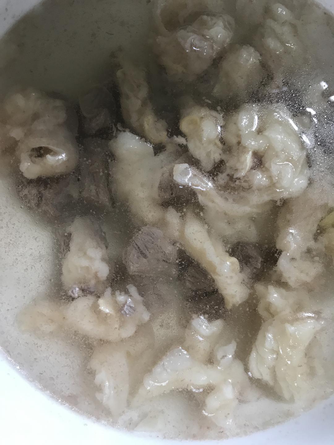 牛肉冷水焯,加姜片,料酒,捞去浮沫,把牛肉带肉汤一起倒入碗里.(如果不喜欢之后用肉汤的就捞出牛肉就行)