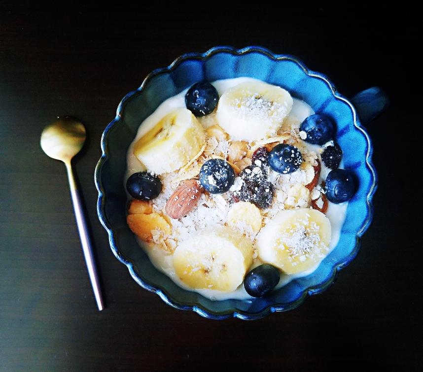 香蕉&蓝莓酸奶 350ml酸奶倒入碗中八分满,摆上香蕉、蓝莓、巴旦木、玉米片等,撒上椰子片、麦片等装饰,完成。