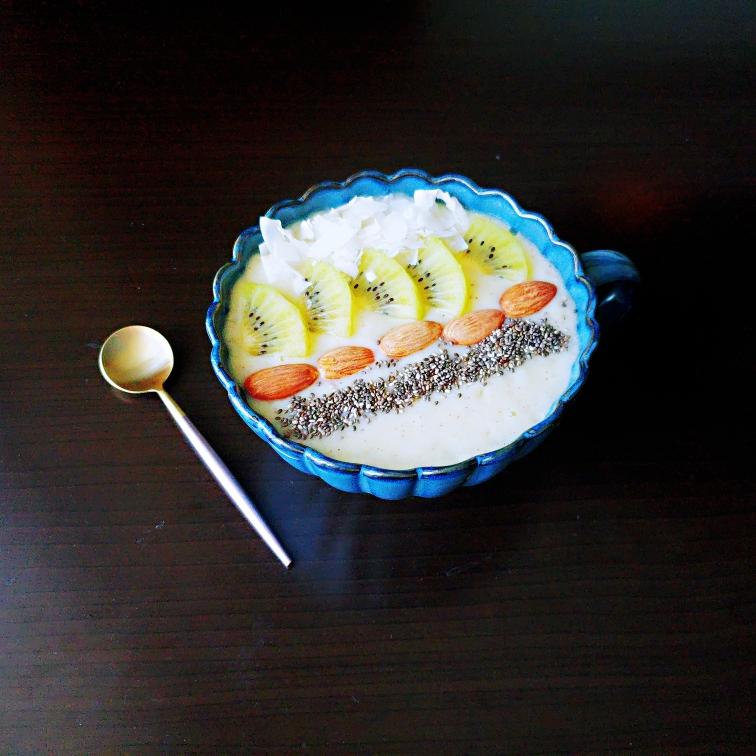 淡绿色思慕雪 200ml酸奶+2个奇异果(留几片装饰用)+1根香蕉,放入料理机中打成泥。 倒入碗中八分满,摆上奇异果、巴旦木、椰子片、奇亚籽(一种很健康又很有饱腹感的谷物)等装饰,完成。