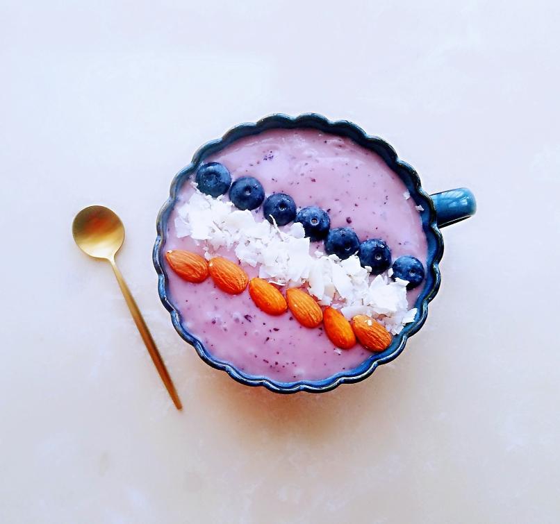紫色思慕雪 200ml酸奶+1盒蓝莓(留几颗装饰用)+1根香蕉,放入料理机中打成泥。 倒入碗中八分满,摆上蓝莓、巴旦木、椰子片等装饰,完成。
