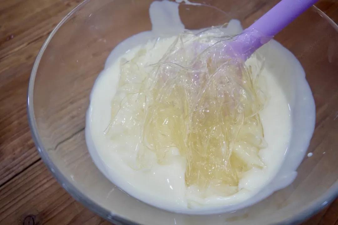 再加入挤去水份的吉利丁片,拌匀,吉利丁片会充分融化,此为奶酪糊。(若吉利丁融化不彻底,可再次置于60度温水浴上搅拌并过筛)