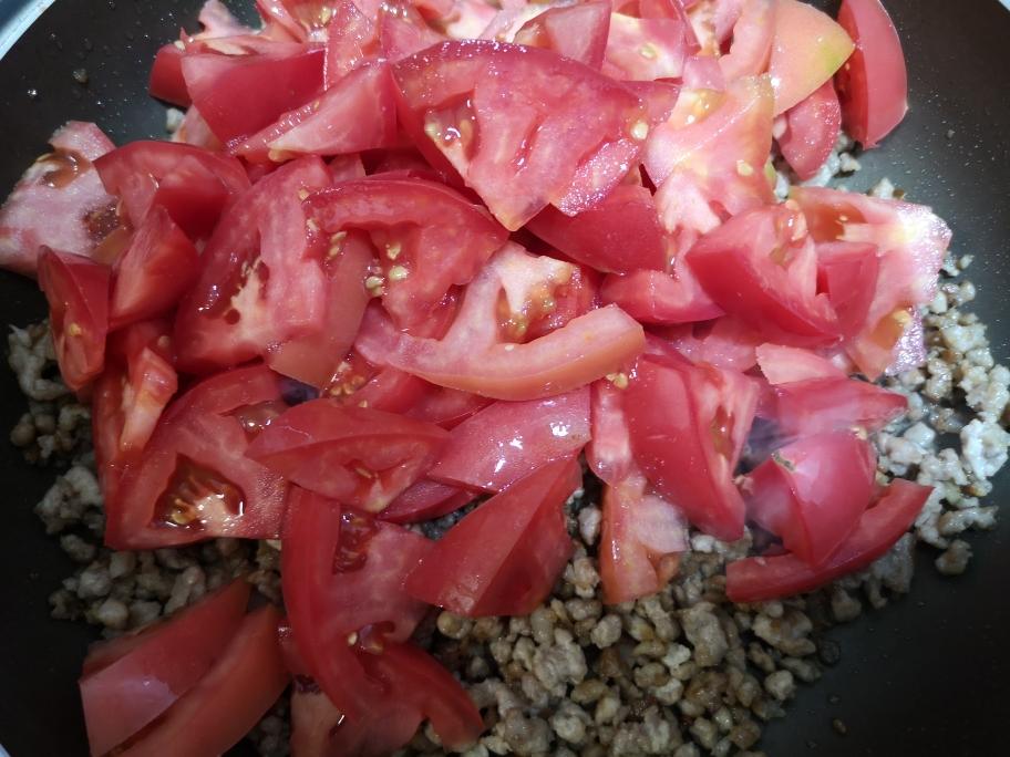 将西红柿加入肉馅中一同翻炒均匀,此时转小火。