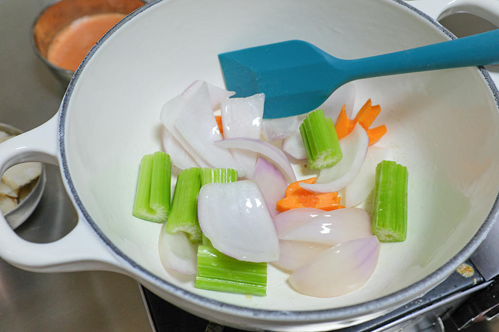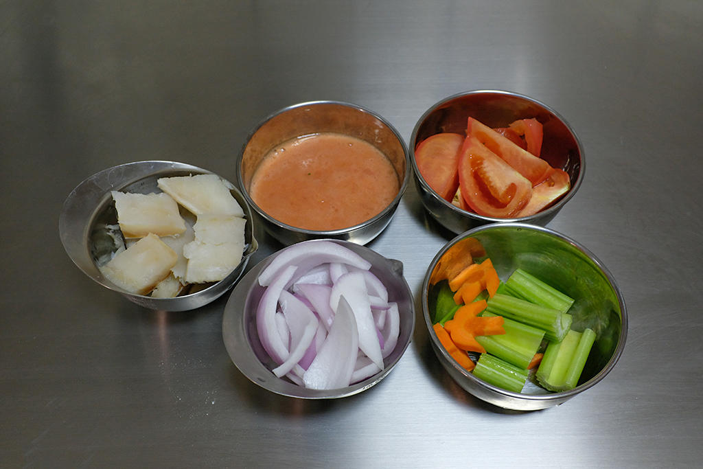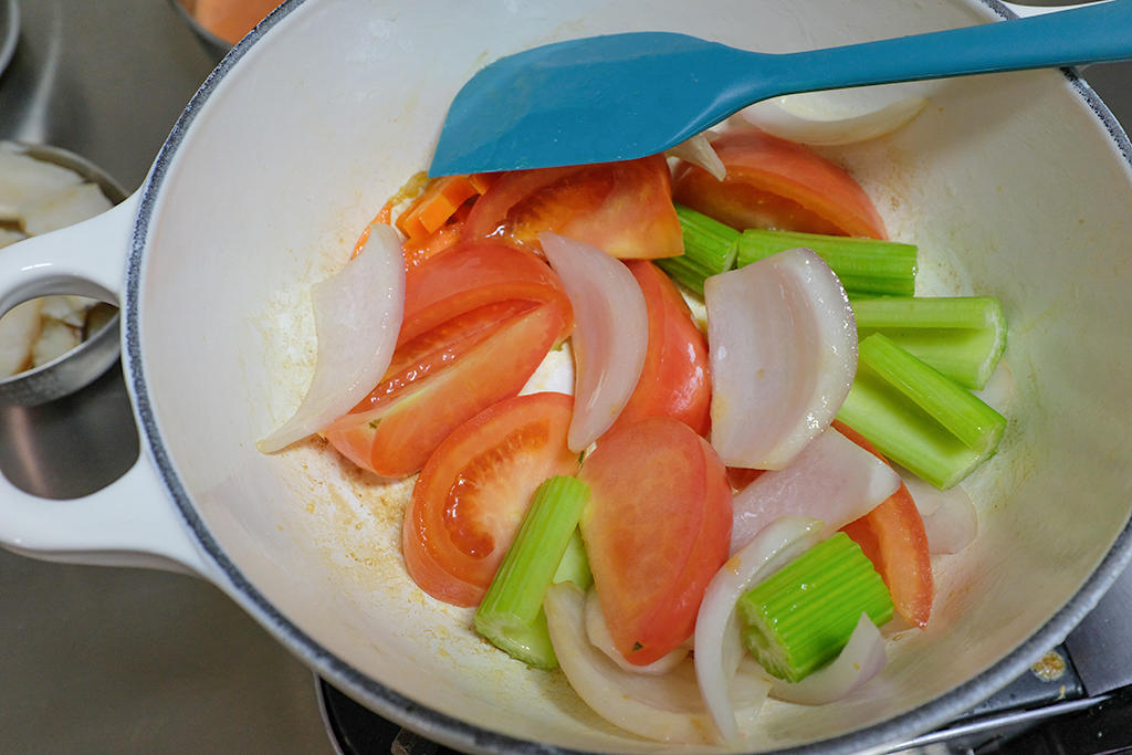 准备食材: 番茄一半用搅拌机打成番茄汁,一半切块备用。 鳕鱼、洋葱、西芹、胡萝卜切好备用。