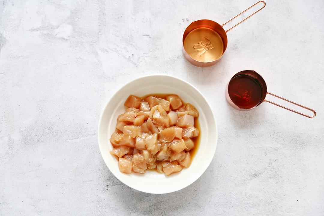 鸡肉切丁,加料酒生抽腌制10-20分钟后沥干待用。
