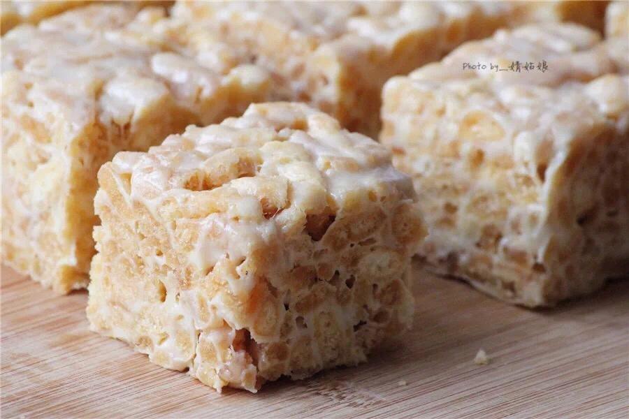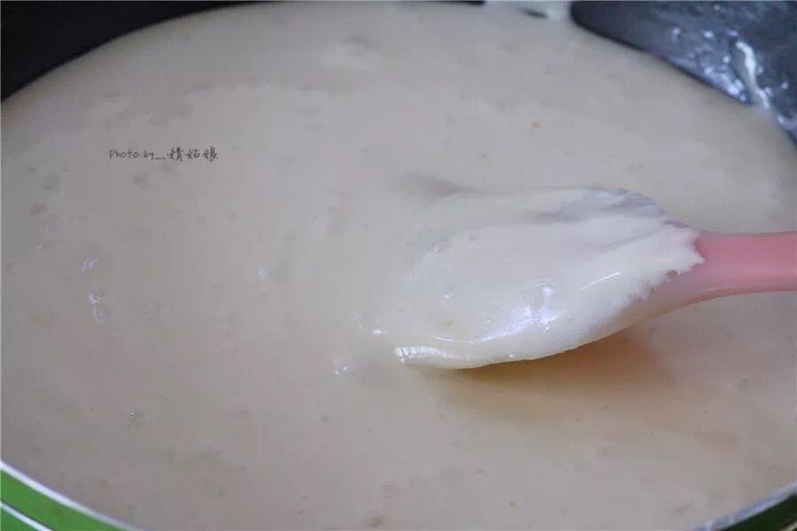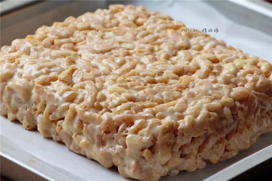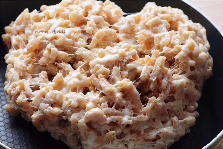 倒入棉花糖,继续小火加热,用刮刀不停地按压、翻拌,直到黄油和棉花糖完全混合,关火。