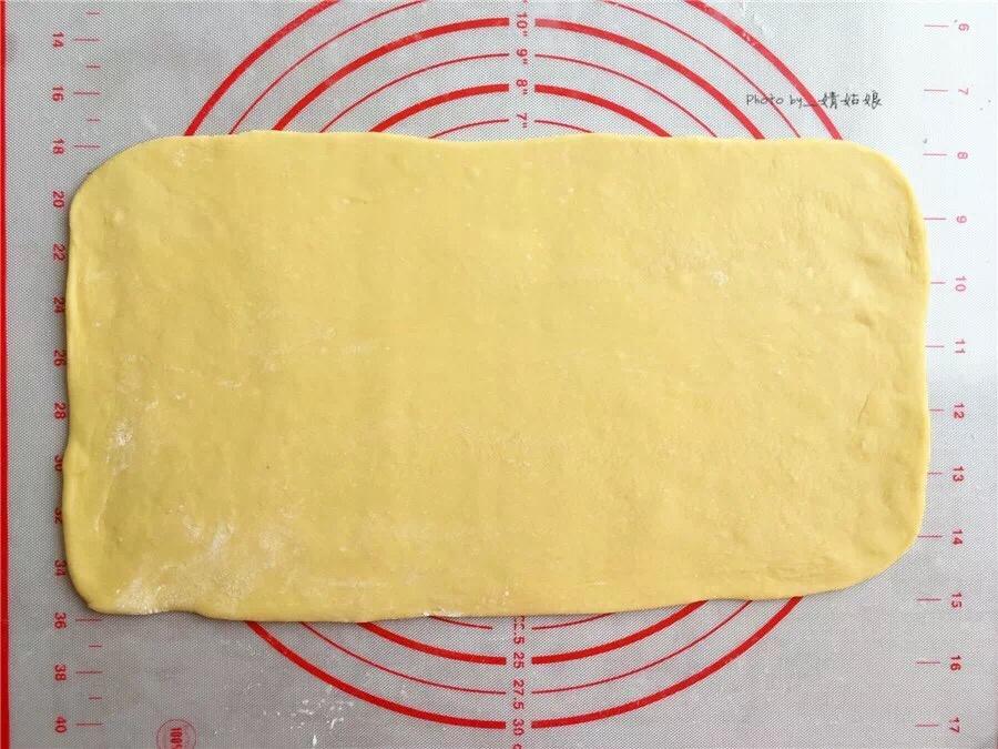 在操作台上撒些面粉,面团表面也撒上面粉,将面团擀成2mm厚的面片。