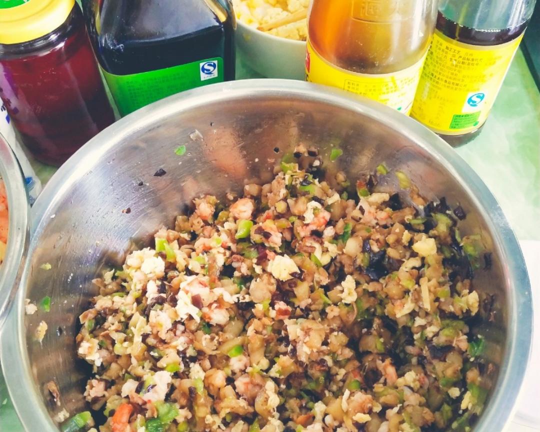 1.茄子辣椒用油炒过口感更好!调馅盐味一定要够,淡了不鲜,咸了不好吃😂 2.☞独家窍门:调馅盐量掌握不好,可以先包两个水饺用水煮熟,尝下味道,淡了加盐,咸了加菜,灵活掌握! 3.和面水量要慢慢加,不要生搬方子里的水量。妹妹和的面忘记拍照记录了🙈我出门买葱。4.自制虾油:剥虾仁,虾头留着,锅里多倒些油,放虾头中小火煸炒,用铲子反复按压虾头,油会红亮的。虾头煸的硬脆,油红色时关火。晾凉后放消过毒的瓶子里盖好盖子冷藏保存。