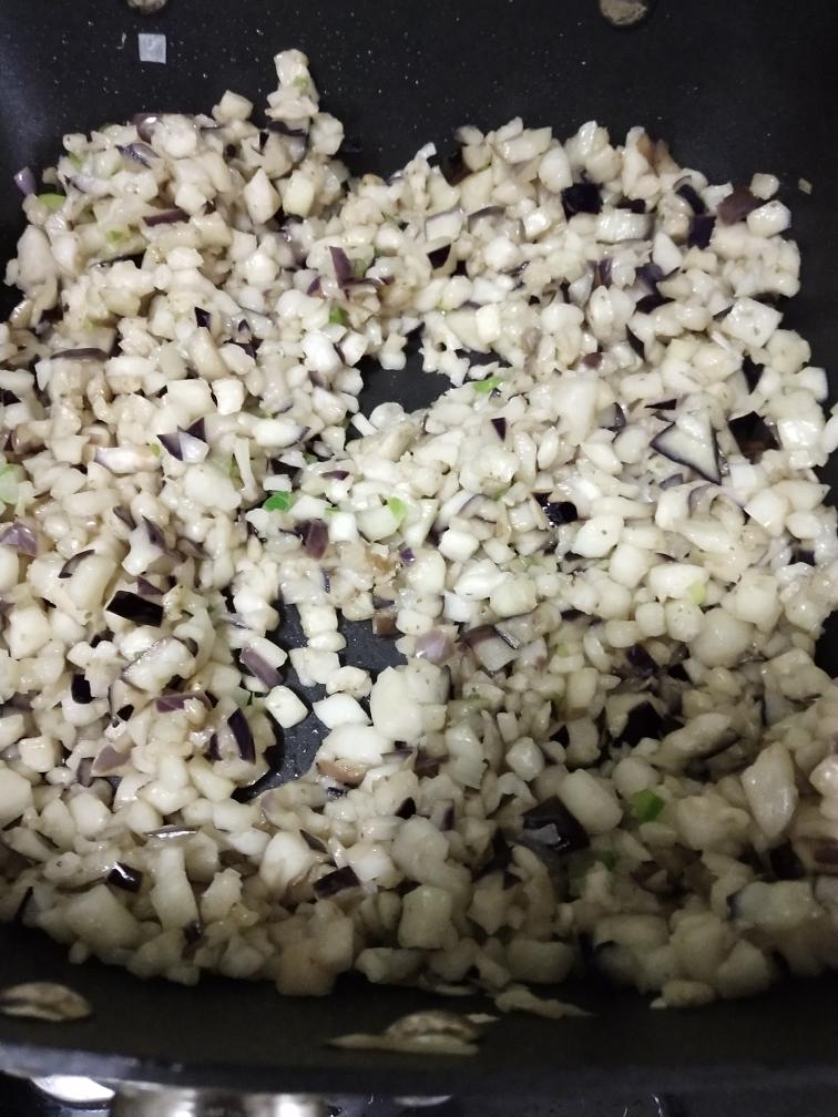 茄子切丁加盐杀出汤汁用屉布攥去多余的汁水(剩下370克)
