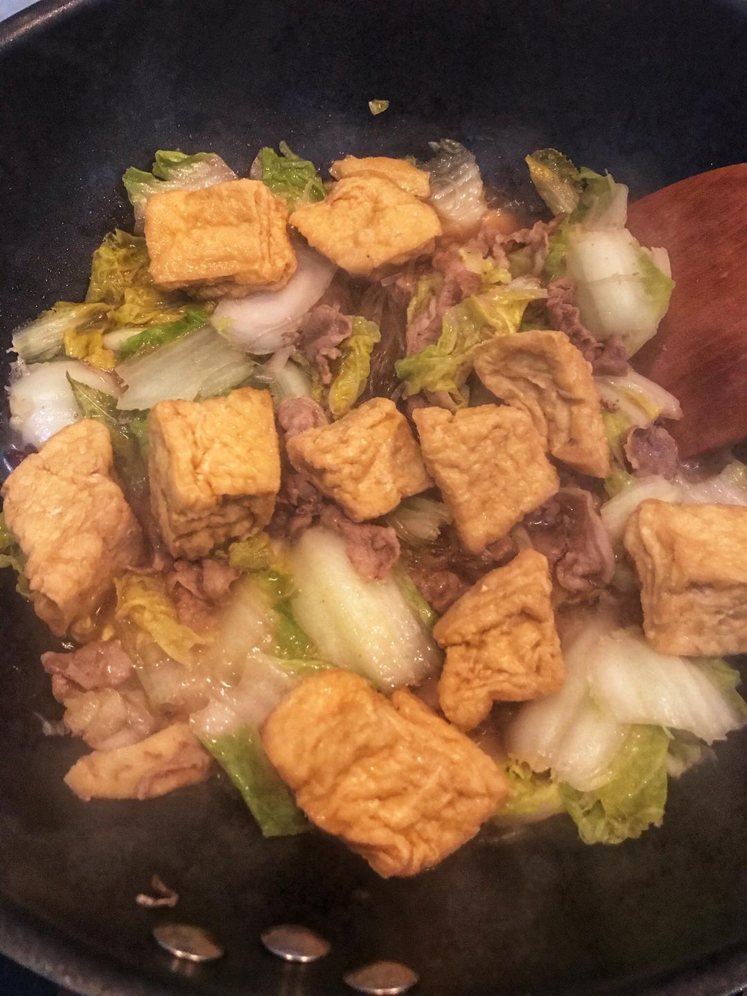 放好调料继续翻炒,这会就可以下豆泡了,因为豆泡是熟的,所以不用过早下入锅。注意:我在豆泡上都划了十字刀口,这样有助于吸收汤汁,更入味。
