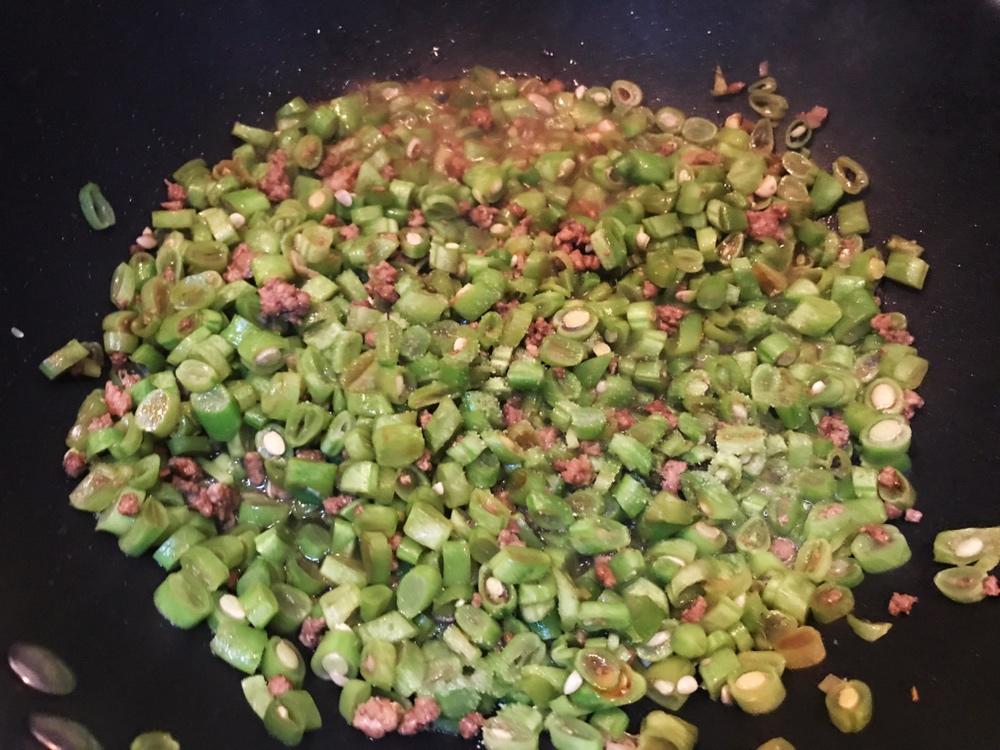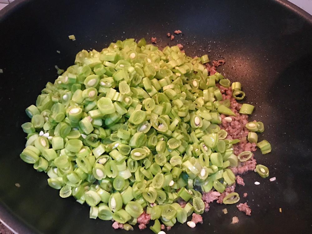 然后放入切好的四季豆,大家可以尽量把四季豆切的小一些,这样好熟而且入味。