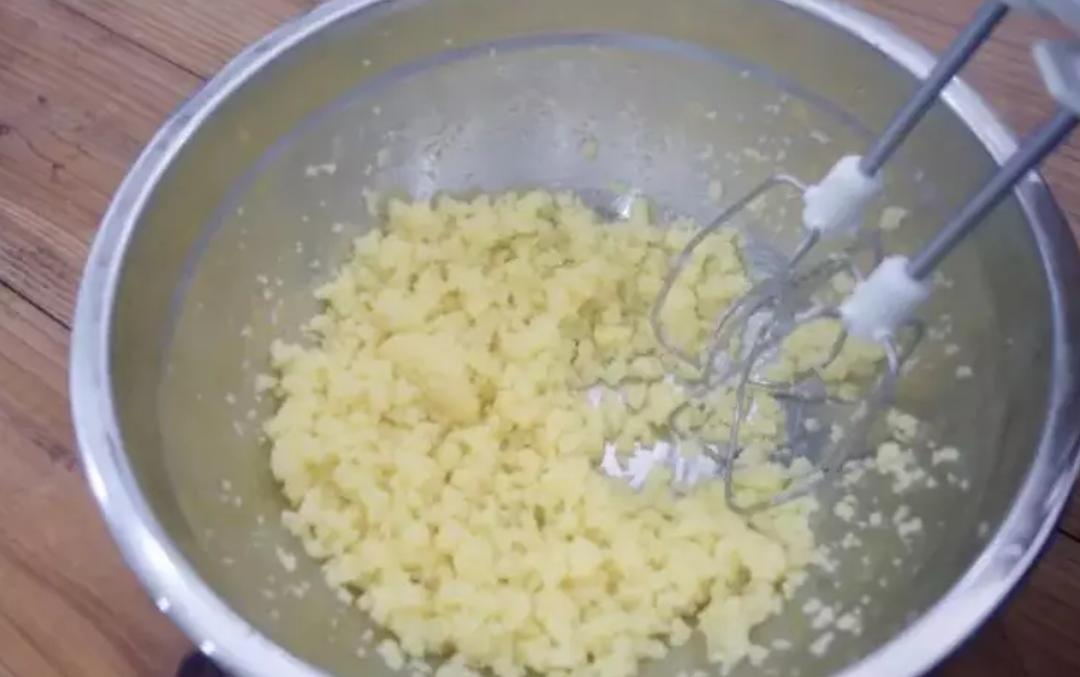 倒入稍大的一个盆中,用打蛋机低速搅打,主要目的是让面团进行适当降温,防止之后加入蛋液,因温度过高,而形成蛋的颗粒。