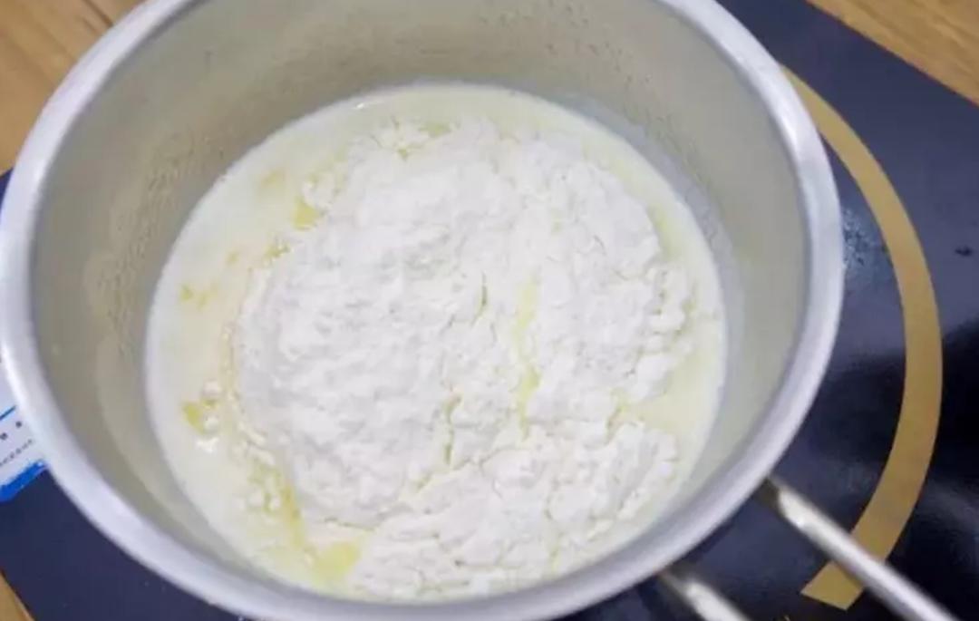 牛奶、水、黄油、盐混合加热至沸。千万不要过度加热,会影响液体比例,煮开即可离火。