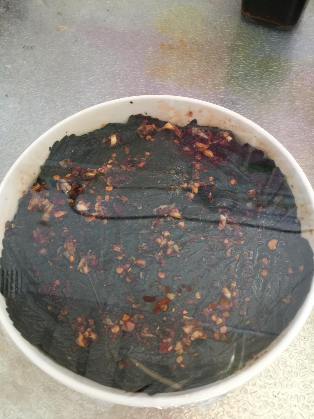 准备容器最好带盖,或者用保鲜膜也行 碗底稍微涂点酱汁 左右各取4到6片左右苏叶铺一层,涂层酱汁 用刷子或者勺都可以 看别人的菜谱一片一涂,那卖咸菜的会累死 就4.5片就很入味了