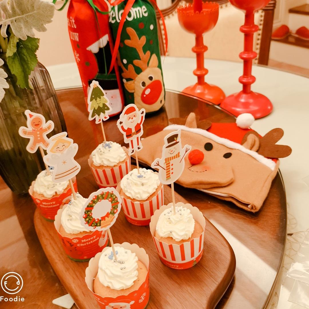 纸杯蛋糕提前做好,淡奶油打硬裱花,撒上糖珠,插上有圣诞元素的小插牌,是不是很有气氛?