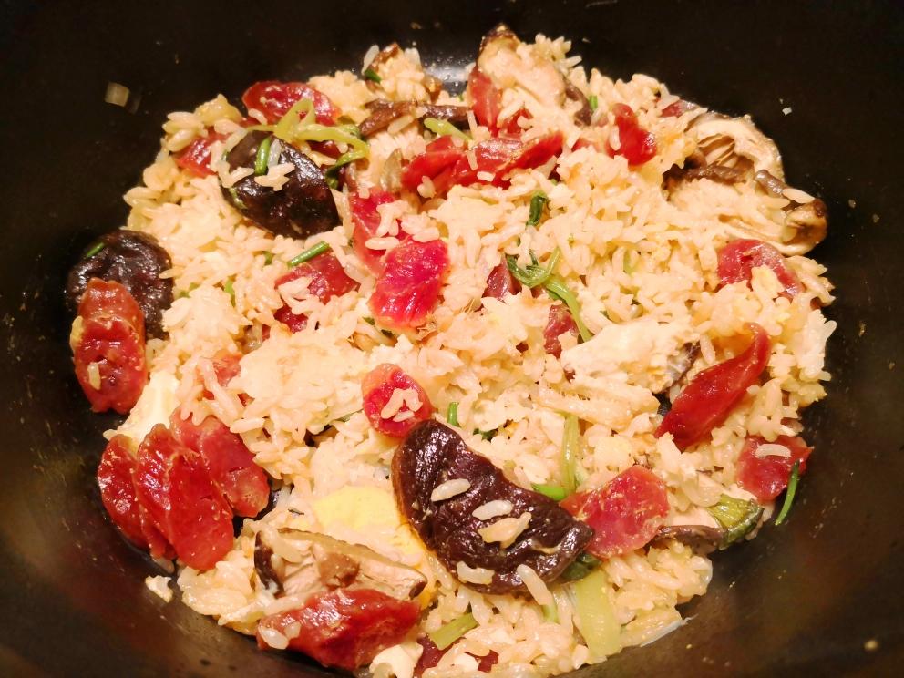 1香菇提前浸泡才够软 2香肠最好蒸一下切片,不会过硬 3绿叶菜可以再晚些入锅 4小火多焖会锅底可结成锅巴