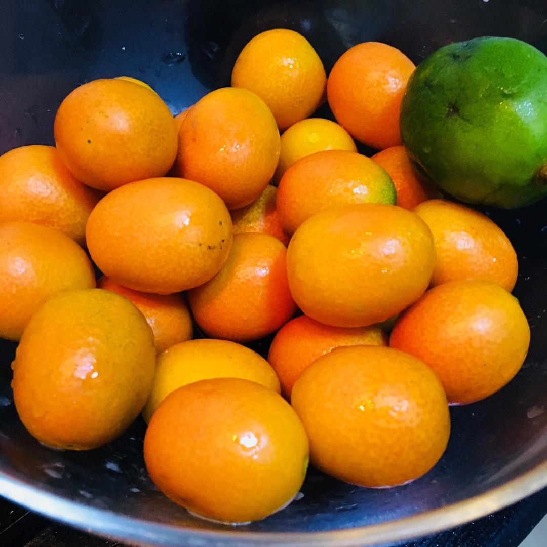 金桔和柠檬用盐水侵泡半小时左右。我家里没有黄柠檬了,正好有一只青柠。