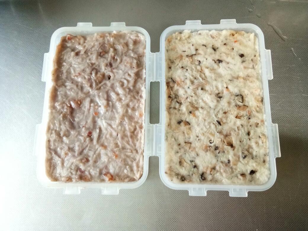 出锅啦,左边是芋头糕,右边是萝卜糕,一定要等完全凉透之后再切,不然会碎,切之前刀上涂点点油防粘