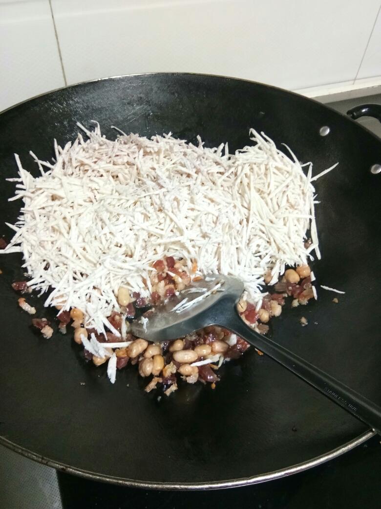 热锅凉油爆香虾米,然后加入腊肠花生,加五香粉,盐和胡椒粉,这个时候尝一下味道,因为芋头加进去就试不了味道了,芋头不能吃生的,吃起来感觉很咸才可以,然后加芋头丝翻炒五分钟盛出备用
