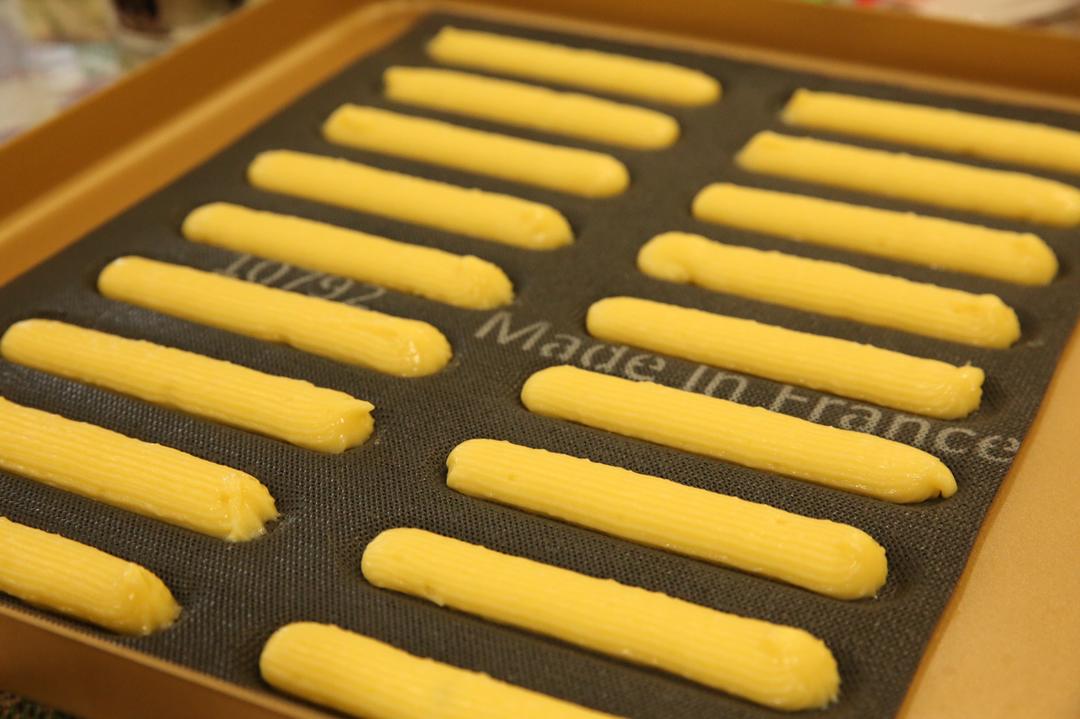 然后装入裱花袋中,挤出长 12cm左右大小均匀,没有气泡的面闪电面团,尽量挤的标准一些 烤出来也更好看,还有歪歪扭扭和有气泡也容易导致烤制时受热 不均而开裂。 挤好的面团喷点水撒糖粉放入冰箱冷藏松弛2小时。 预热烤箱175度,烤35分钟左右,温度可根据自家烤箱脾气调整。