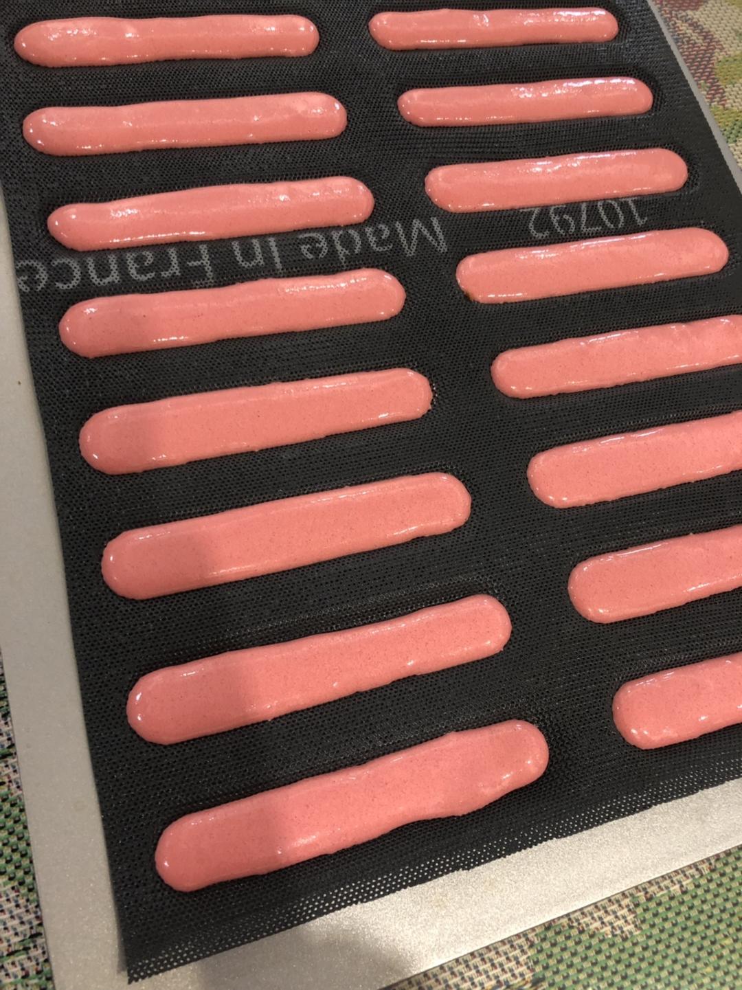 出炉后的马卡龙放凉入冰箱冷冻一会让其充分降温,取出用可可脂和白巧克力加红色色粉溶解后在35度左右进行喷砂。