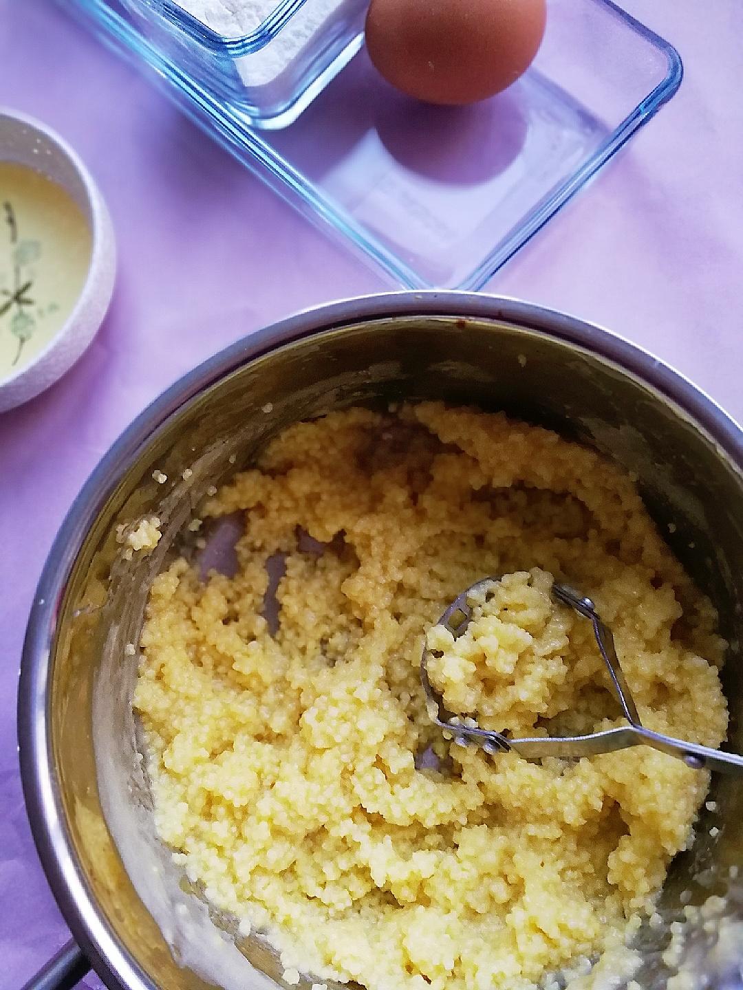 用勺子把煮熟的小米粒压烂