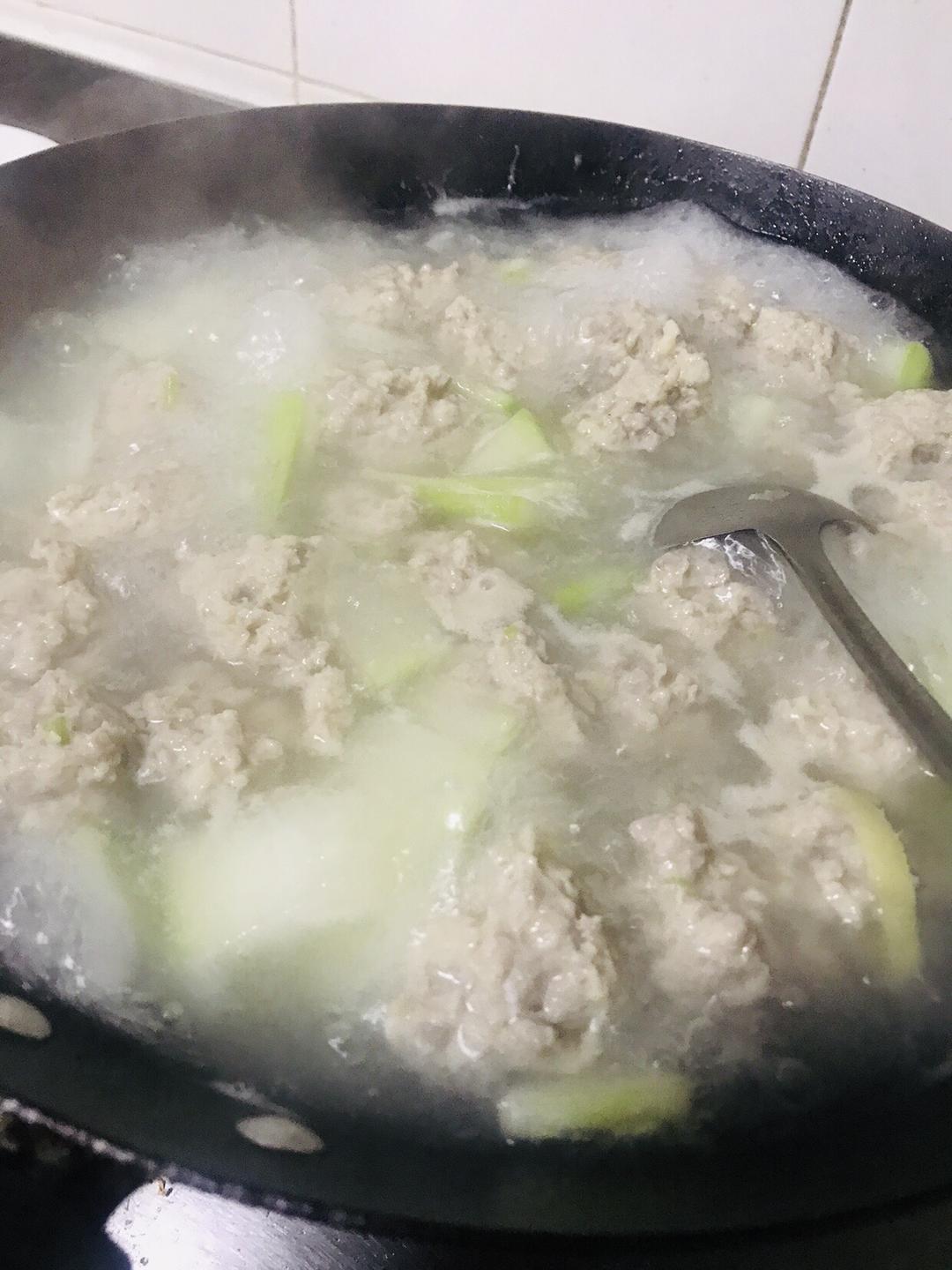 丸子都弄好后,放入冬瓜。 倒入:酱油少许,盐少许,香油少许。
