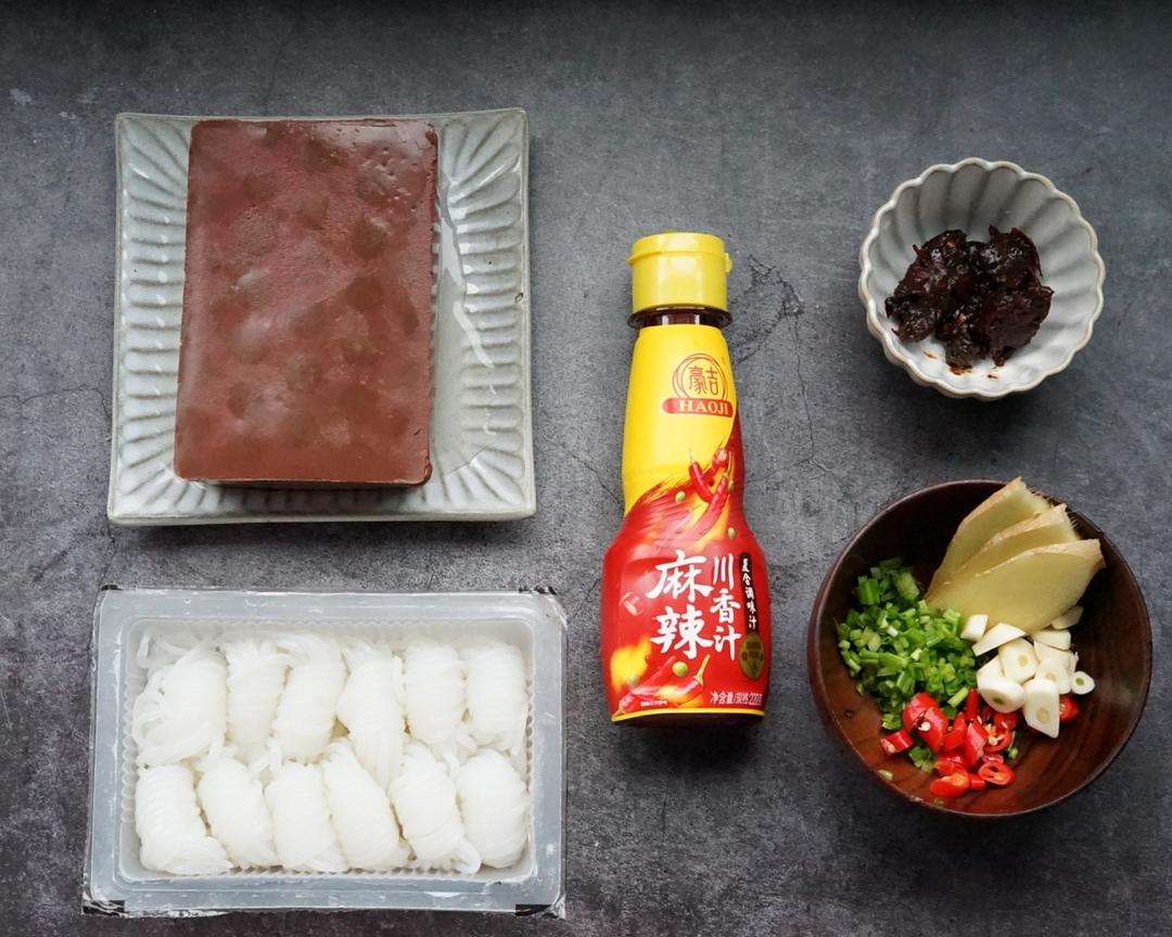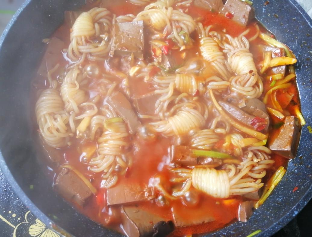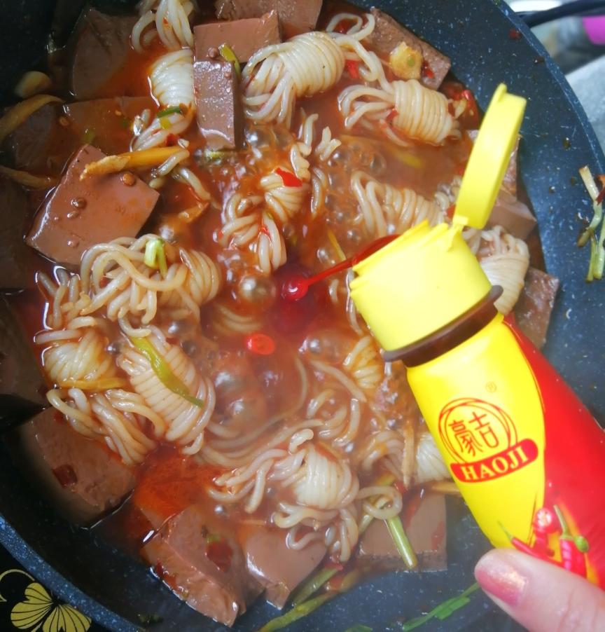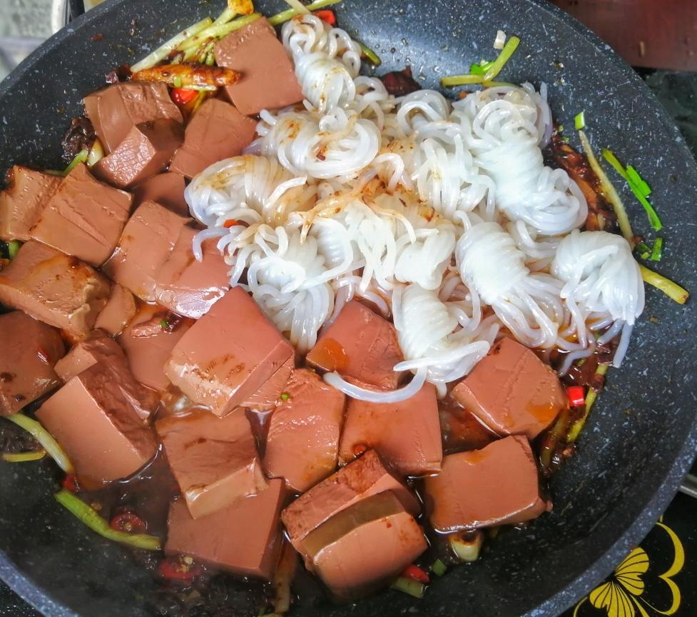 加入鸭血和魔芋翻炒均匀,可以用锅铲用推拌的方法,防止鸭血碎掉。