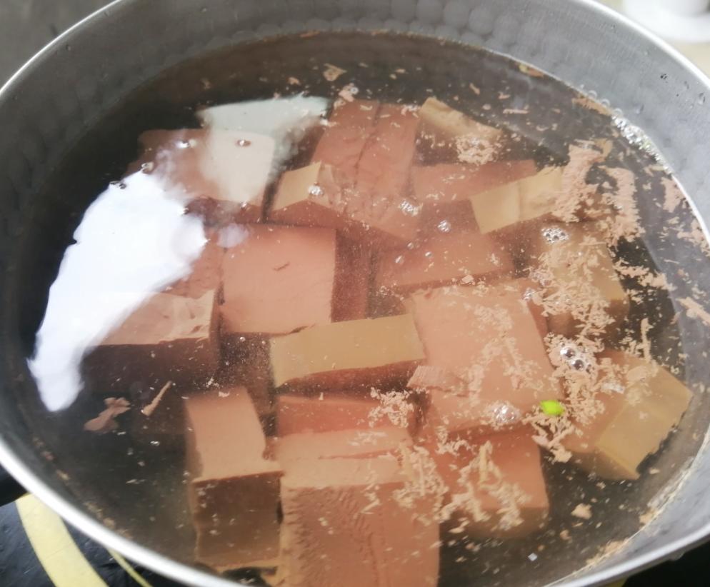 鸭血切成厚约1CM的小块 与冷水一起放入锅中煮开后,加入两勺料酒去腥。再把浮沫和煮鸭血水一起倒掉