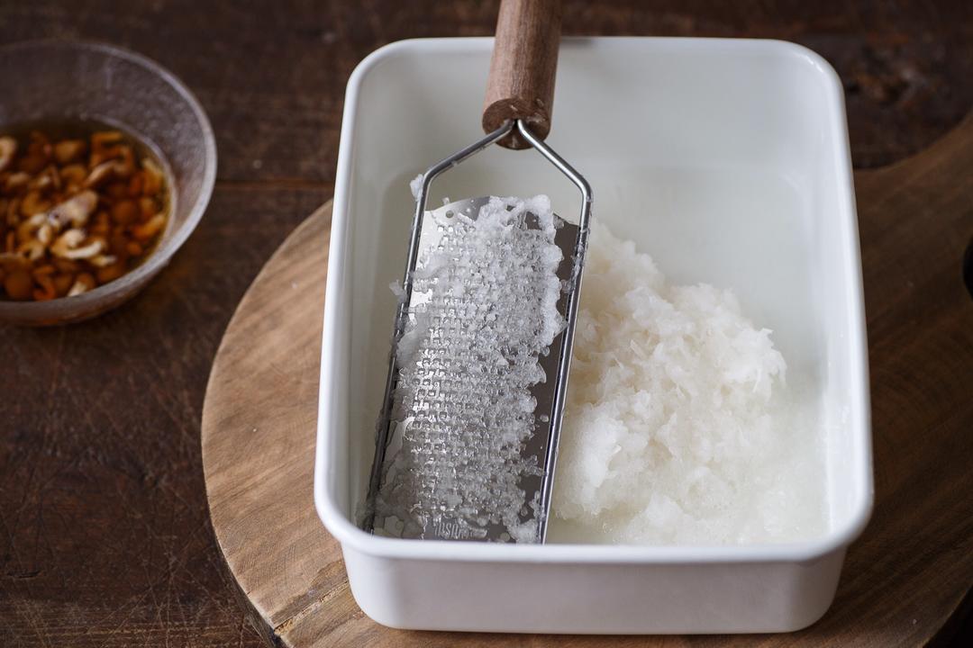 将萝卜里的水分挤出备用,大约有170g