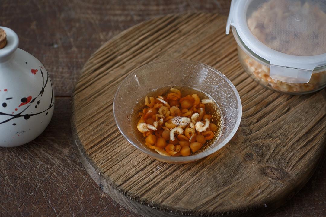 虾干干贝用黄酒泡发约30分钟后,沥干切碎