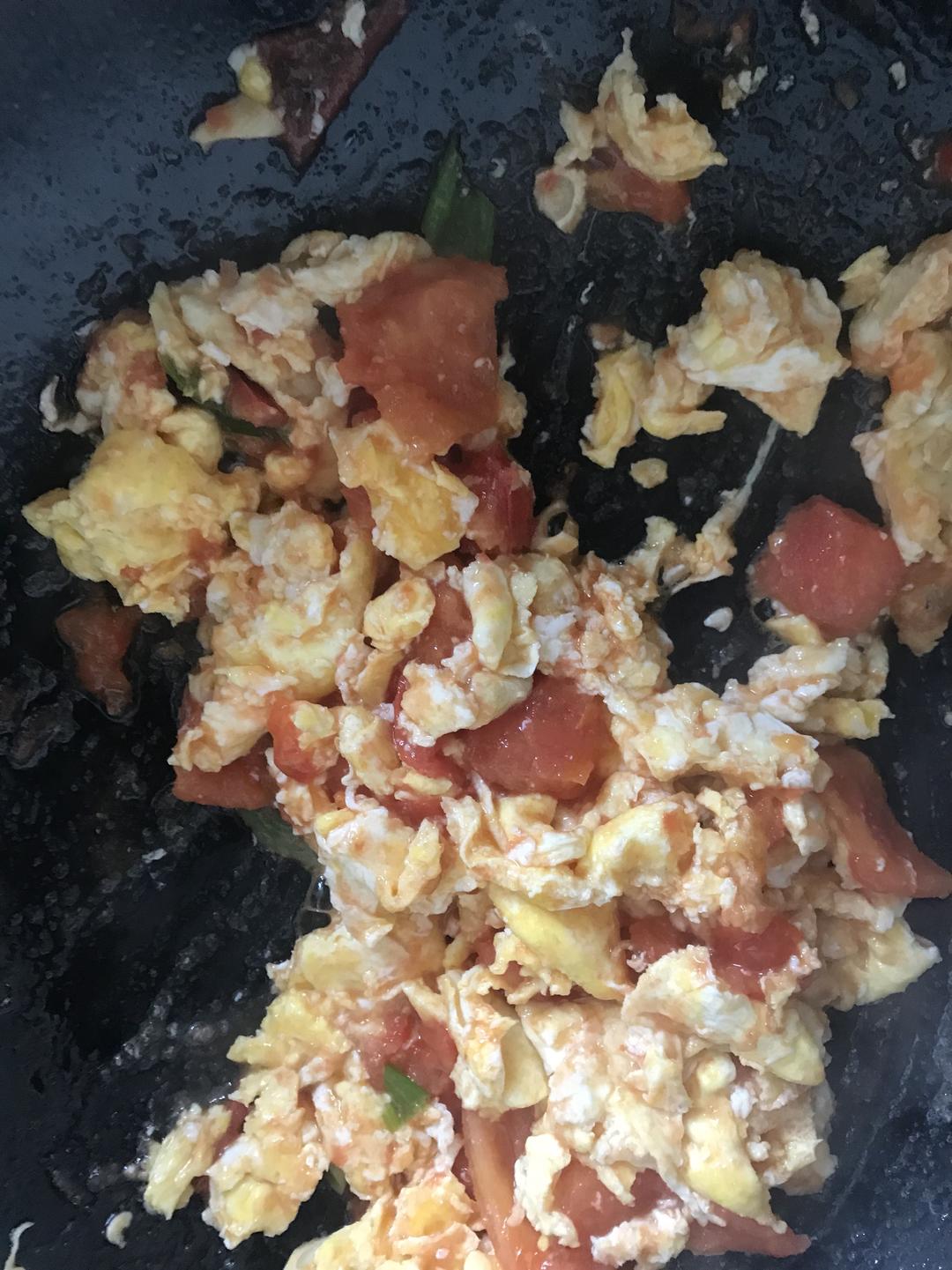 再加一点油加入香葱和西红柿,加入一点糖和盐翻炒西红柿,炒到西红柿软烂