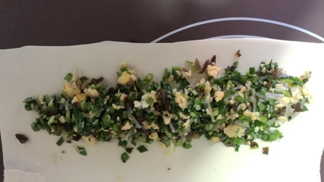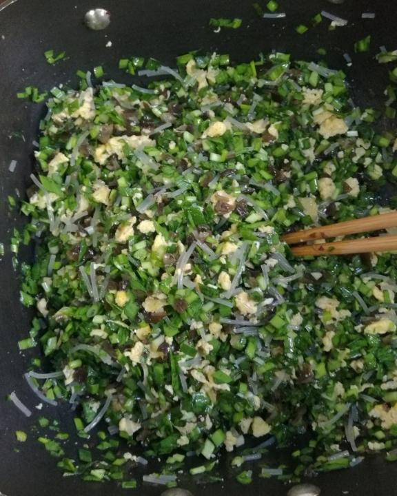 倒入切碎的韭菜,粉条,木耳。