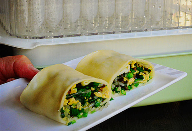 然后,把面皮包裹着菜馅卷紧卷起来,两端收口。这样卷出来是一层面一层菜。