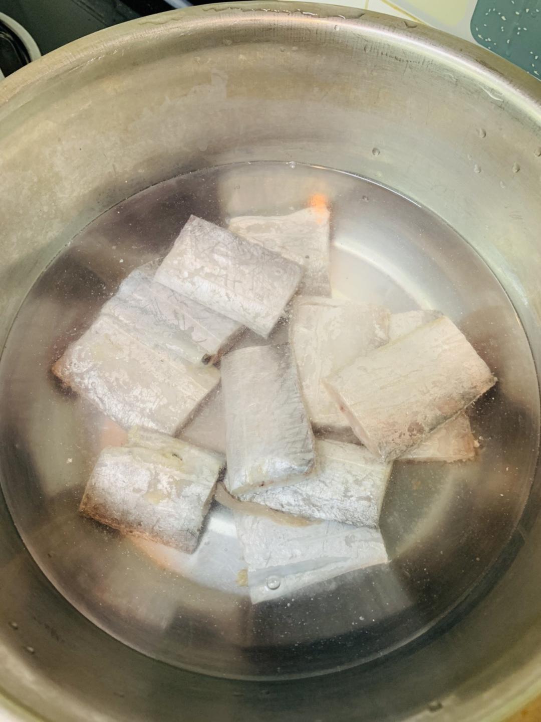 带鱼洗净切段,放凉水里,加热至60度,水中有小泡即可,千万别让水开了哈!
