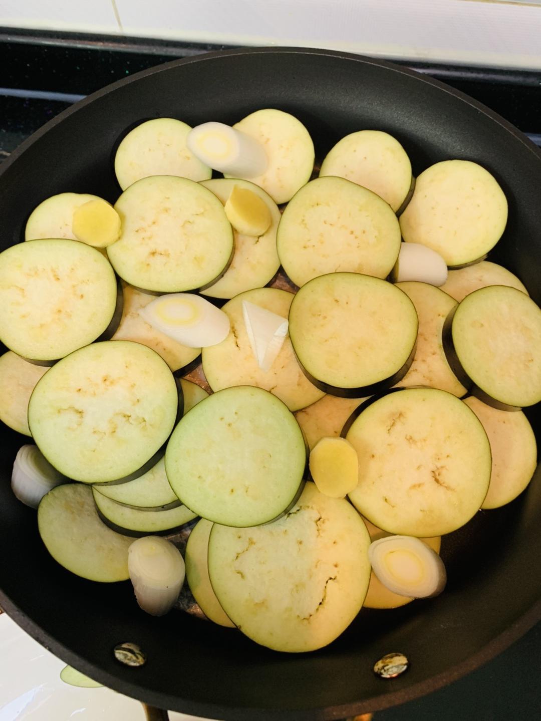 茄子铺在带鱼上边,葱姜蒜放缝隙里