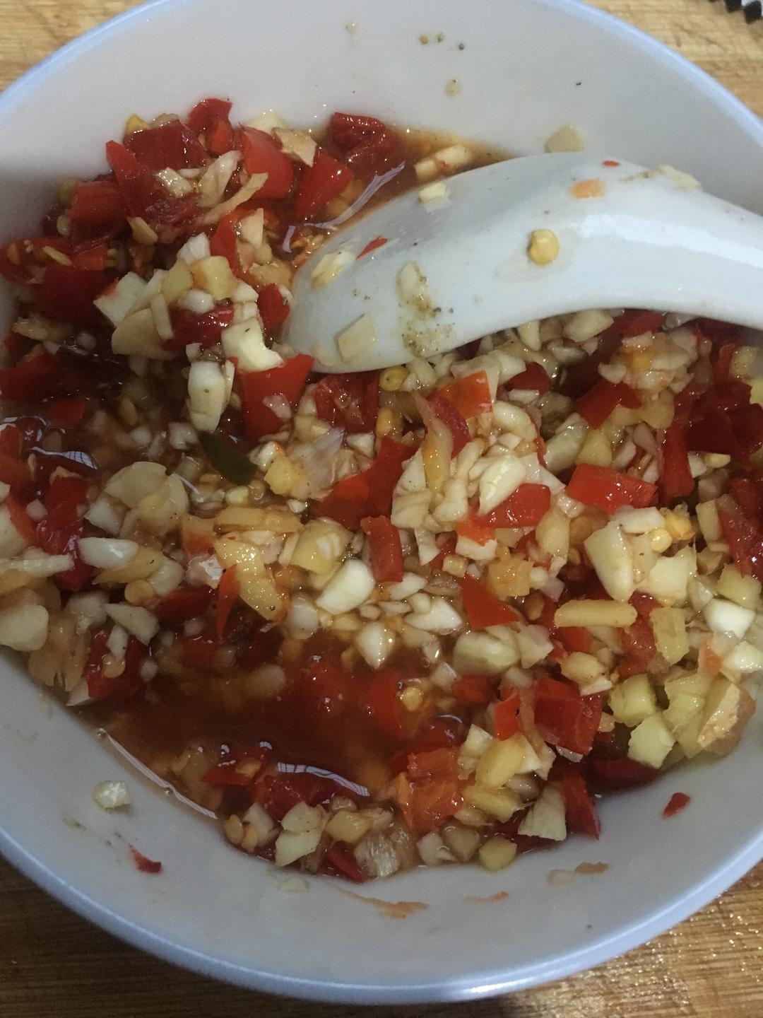 把上面写的调料、大蒜、生姜切末、剁椒、一勺黄酒、一勺生抽(家里有蚝油、蒸鱼豉油也可以放)糖、胡椒粉、白醋等等你喜欢的调料放碗里拌匀。