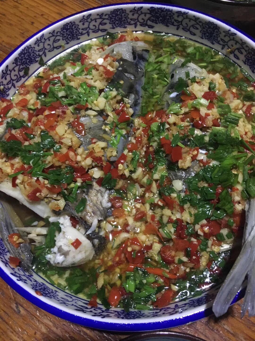 平铺在鱼身上,锅里水大火煮开,中火蒸20分钟左右(按鱼头大小调整时间)