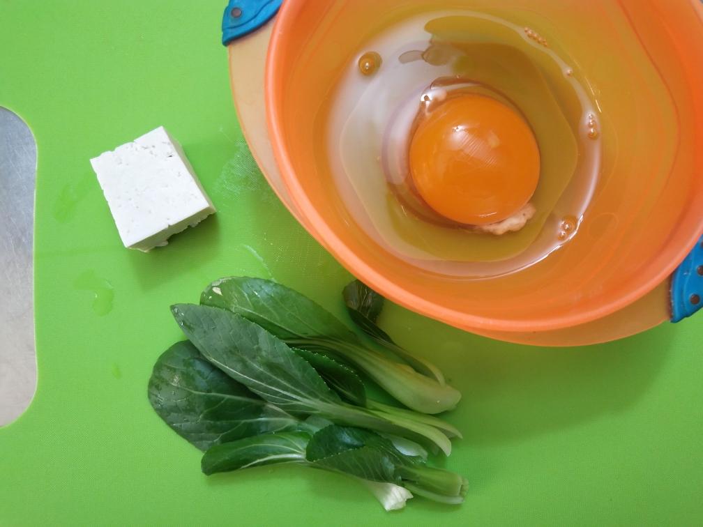 把豆腐和青菜加入鸡蛋里(不能吃蛋清的宝宝就加入一个蛋黄),搅拌均匀后加入50°左右的温水,水的用量跟平时蒸鸡蛋羹一样